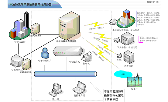 如拓樸圖所標,寧波市政府、寧波水利局與奉化市三防辦均采用了加拿大Eicon 公司與拓敏聯(lián)合推出的傳真服務器系統(tǒng),可進行針對需求的智能設定傳真發(fā)送。