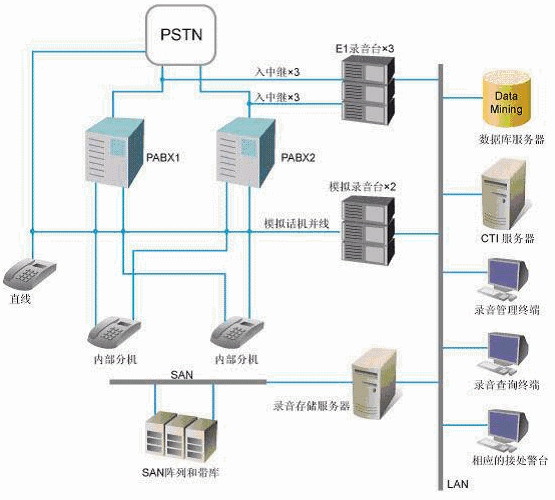 錄音系統(tǒng)還要求錄音文件統(tǒng)一保存在基于SAN結(jié)構(gòu)的存儲系統(tǒng)中,并具有完備的存儲、備份功能。