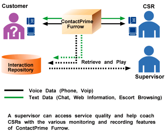 ContactPrime Furrow提供的完全記錄解決方案可以協(xié)助進行訓(xùn)練、性能評估、交易驗證與爭議解決等工作。不僅記錄語音呼叫,而且對于聊天、陪同瀏覽和Web互操作等文本行為也可記錄。