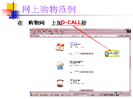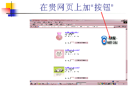 簡單地說,就是當有客戶瀏覽到網上購物的網頁時,若有任何疑問或想立即購買,只要點擊在網頁上的“按鈕”鍵,就可以直接接通到網站的客服中心,實現即時地語音互動。也不需再像以前那樣發(fā)E-MAIL或撥電話號碼了。效果可謂是立竿見影。(如圖示)