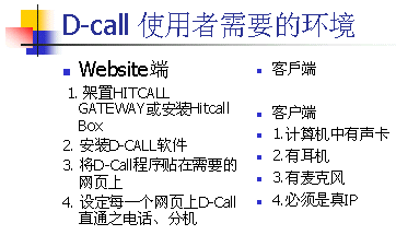 D-CALL指的是”Direct Call on Web”,提供電子商務中客戶與企業(yè)間網上實現網上實時語音互動平臺。