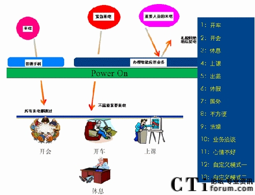 智能應(yīng)答業(yè)務(wù)是針對(duì)消費(fèi)者不便通話時(shí)的一個(gè)增值業(yè)務(wù)。當(dāng)被叫用戶有來(lái)電時(shí),因?yàn)樽约旱脑虿槐阃ㄔ挾鴴鞌嚯娫捄笸ㄟ^(guò)手機(jī)彈出的菜單,供用戶選擇與對(duì)方進(jìn)行的后續(xù)溝通。被叫用戶可以根據(jù)所處的情況選擇對(duì)應(yīng)的情景,系統(tǒng)將根據(jù)用戶選擇的情景對(duì)應(yīng)給主叫用戶發(fā)送短信和放音。智能應(yīng)答業(yè)務(wù)給了我們禮貌拒接的機(jī)會(huì)。當(dāng)您正在會(huì)議室里和客戶如火如荼的策劃下個(gè)項(xiàng)目,當(dāng)然不想被其他人打擾。突然有個(gè)電話打了進(jìn)來(lái),接還是不接,不接有可能是一個(gè)潛在的客戶,接了又是對(duì)目前工作的一種打斷。如果你辦理了智能應(yīng)答業(yè)務(wù),當(dāng)你掛斷電話的同時(shí)手機(jī)上將出現(xiàn)一個(gè)菜單,你可以根據(jù)當(dāng)前具體情況選擇目前所處的情景(開(kāi)車(chē)、開(kāi)會(huì)、上課……等)。如你選擇了某種情景,系統(tǒng)將根據(jù)用戶選擇的情景,給主叫用戶播放相應(yīng)的語(yǔ)音通知(如:“您撥叫的用戶正在開(kāi)會(huì),請(qǐng)稍后再撥”)。