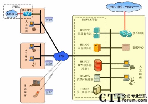 - 接入部署:客戶只需確定中繼接入的號碼(包括400、800、95xxx等)、規(guī)模,通過運營商將號碼指向產業(yè)基地統(tǒng)一接入平臺即可完成部署。