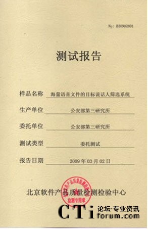 CTI論壇(ctiforum)06月25日消息: 2009年3月02-10日:北京軟件產品質量檢測檢驗中心對《海量語音文件的目標說話人篩選系統(tǒng)》進行了全面測試包括用戶文檔、功能性、可靠性、易用性、可維護性等多個特性。測試結果表明《海量語音文件的目標說話 2009年3月02-10日,北京軟件產品質量檢測檢驗中心對《海量語音文件的目標說話人篩選系統(tǒng)》進行了全面人篩選系統(tǒng)》滿足軟件相關國家標準中的要求,系統(tǒng)在模擬測試環(huán)境中運行正常、穩(wěn)定,正式通過北京軟件產品質量檢測檢驗中心的嚴格測試,系統(tǒng)的漏識率和誤警率分別達到了2.81%和 2.81%。