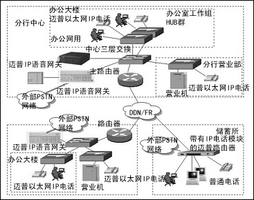 分行中心與下面的支行以及各儲蓄網點根據業(yè)務應用需求出發(fā),可以利用邁普各系列路由器產品,通過DDN或者幀中繼把分行辦公大樓和營業(yè)部、支行辦公大樓和營業(yè)部、分行和支行下屬儲蓄所連起來。對于分行中心以及下面的支行,由于網絡結構比較復雜,再加上網絡基礎設施建設已經很完善,一般可以采用邁普IP語音網關,通過它與原有的外部PSTN網絡相連。而對于一些較小的儲蓄網點,則可以通過采用帶有IP電話模塊的邁普路由器。邁普路由器的IP電話模塊可與電話機或交換機相連,能夠支持G.711、G.723、G.729等多種語音壓縮算法,并且還支持H.323協(xié)議,實現IP電話功能。