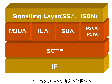 如圖所示,Trillium可提供完整的SIGTRAN協(xié)議棧解決方案,包括SCTP、M3UA、M2UA、M2PA、SUA、IUA,其共同的特點(diǎn)如下: