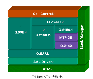 Trillium提供完整的ATM協(xié)議棧,同時支持ITU和ATM Forum的標(biāo)準(zhǔn),相關(guān)產(chǎn)品包括AAL2 Signalling(Q.2630.1、Q.2150.1和Q.2150.2)、Q.93B(Q.2931)、Q.2140、Q.SAAL(Q.2130、Q.2110)、B-ISUP、VTOA、IME(ILMI