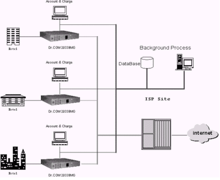 本文提出的方案就是采用第二種方案設(shè)計(jì)的。所采用的互聯(lián)網(wǎng)接入服務(wù)器就是一臺(tái)Dr.COM(通訊博士) 2033 BMG 計(jì)費(fèi)管理網(wǎng)關(guān),每個(gè)客人入住登記時(shí),如果需要申請(qǐng)開(kāi)通互聯(lián)網(wǎng)服務(wù),服務(wù)員開(kāi)通一個(gè)賬號(hào),由客人自己輸入一個(gè)密碼?腿司涂梢栽诜块g使用自己的手提電腦或酒店提供的電腦,通過(guò)酒店的局域網(wǎng)訪問(wèn)互聯(lián)網(wǎng)。等客人結(jié)賬離開(kāi)前,可以打印出上網(wǎng)的詳細(xì)紀(jì)錄,作為客人的結(jié)賬單。也可以提供一個(gè)賬單紀(jì)錄的數(shù)據(jù)出口,連接到酒店的服務(wù)器,由酒店的服務(wù)器進(jìn)行計(jì)費(fèi)管理。