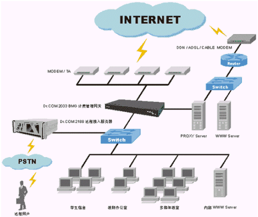 Dr.COM 2188遠(yuǎn)程接入服務(wù)器系列產(chǎn)品,該系列產(chǎn)品向用戶提供了內(nèi)置的15個(gè)MODEM用作遠(yuǎn)程接入,配套提供專業(yè)開戶、計(jì)費(fèi)、統(tǒng)計(jì)、監(jiān)視和查詢等網(wǎng)絡(luò)版營運(yùn)軟件及數(shù)據(jù)庫接口和串行計(jì)費(fèi)接口。使校園網(wǎng)用戶可通過公用電話網(wǎng)(PSTN)對校園網(wǎng)內(nèi)資源進(jìn)行訪問。