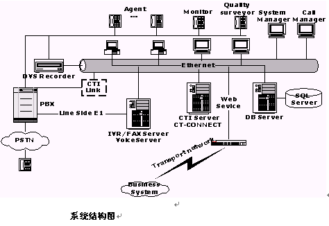 交換機(jī)實(shí)現(xiàn)電話呼入、呼出功能;還需要提供自動排隊(duì)機(jī)系統(tǒng),用于實(shí)現(xiàn)對來話的均衡分配;呼叫管理系統(tǒng),用于有效管理所有話務(wù);支持IVR;提供CTI Link模塊作為計算機(jī)/電話集成接口;同時,交換機(jī)還可作為辦公電話交換機(jī)使用,系統(tǒng)可支持多家公司的交換機(jī)。