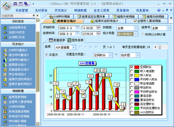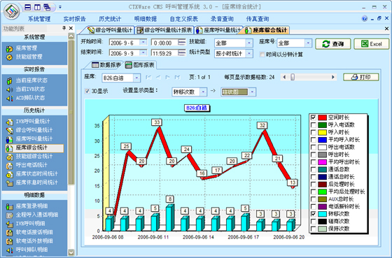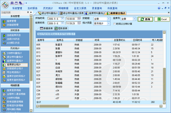 座席綜合統(tǒng)計:可以根據(jù)“月份”、“天”、“小時”來統(tǒng)計每一個座席的綜合指標。統(tǒng)計的指標包括:總登錄時長、空閑時長、呼入電話數(shù)、呼入時長、平均呼入時長、呼出電話數(shù)、呼出時長、平均呼出時長、通話總數(shù)、通話總時長、后處理時長、平均后處理時長、AUX總時長、電話振鈴時長、平均振鈴時長、轉移次數(shù)、磋商次數(shù)、保持次數(shù)、平均保持時長。