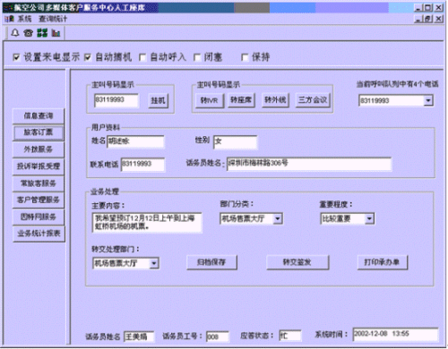。。客戶打入電話后,當(dāng)系統(tǒng)的自動(dòng)語音應(yīng)答子系統(tǒng)無法解決客戶問題時(shí),客戶可選擇人工服務(wù),由航空公司客戶服務(wù)代表直接接聽客戶電話,處理并解決客戶問題。此時(shí)客戶同座席話務(wù)人員直接溝通,并同時(shí)記錄下該客戶的聯(lián)系方式,將相關(guān)數(shù)據(jù)添加入系統(tǒng)數(shù)據(jù)庫;也可以在數(shù)據(jù)庫的支持下回答機(jī)場航班/航空貨運(yùn)信息及相關(guān)規(guī)定等的咨詢和疑問、訂座/訂艙。客戶也可以選擇自動(dòng)語音服務(wù)方式,根據(jù)系統(tǒng)的語音提示輸入按鍵,選擇類別,將自己的投訴和建議以及自己的聯(lián)系方式信息以留言錄音的方式保存在系統(tǒng)中。系統(tǒng)同時(shí)還支持自動(dòng)傳真方式,客戶可以通過傳真機(jī)進(jìn)入本系統(tǒng),通過按鍵選擇傳真方式,將自己的意見建議等的文本內(nèi)容傳真給系統(tǒng),系統(tǒng)自動(dòng)接受并存入數(shù)據(jù)庫。