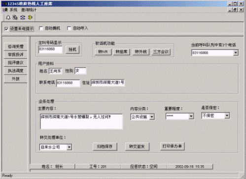 系統(tǒng)提供強(qiáng)大的信息資料處理功能,座席可記錄舉報、投訴、批評、建議等記錄單,將信息資料歸檔保存、打印受理單或?qū)⑹芾韱蔚任募D(zhuǎn)交簽發(fā)相關(guān)政府職能部門;系統(tǒng)引入CRM(Customer