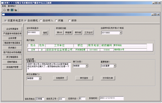 人工座席子系統(tǒng)是人工信息查詢與業(yè)務(wù)受理子系統(tǒng),由業(yè)務(wù)代表、數(shù)字話機、運行Windows系統(tǒng)的PC微機和耳麥以及相應(yīng)的具體業(yè)務(wù)處理應(yīng)用軟件等組成。電話主要用于與客戶通話,PC機主要用于記錄客戶基本信息或服務(wù)信息,或是用于檢索客戶所需的業(yè)務(wù)信息。