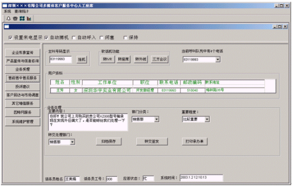 ◇提高企業(yè)親切感:系統(tǒng)在人工服務(wù)狀態(tài)下,當(dāng)業(yè)務(wù)代表輸入客戶名稱時(shí),系統(tǒng)即時(shí)將客戶與企業(yè)相關(guān)的信息顯示在座席終端上,使業(yè)務(wù)及時(shí)了解客戶,有針對(duì)性回答客戶問題,使客戶倍感親切。