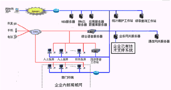 本系統(tǒng)物理結(jié)構(gòu)由帶語音板卡的工控機(jī)或排隊(duì)交換機(jī)、CTI服務(wù)器、IVR(交互式語音應(yīng)答)/IFR(交互式傳真應(yīng)答)服務(wù)器、業(yè)務(wù)代表座席(邏輯上分為:普通業(yè)務(wù)代表座席、專家座席等)、班長座席、統(tǒng)計(jì)維護(hù)管理工作站、因特網(wǎng)(WEB)服務(wù)器、電子郵件(EMAIL)服務(wù)器、數(shù)據(jù)庫/應(yīng)用服務(wù)器、錄音留言工作站、領(lǐng)導(dǎo)查詢工作站、業(yè)務(wù)網(wǎng)關(guān)服務(wù)器、通信網(wǎng)關(guān)、網(wǎng)絡(luò)系統(tǒng)等構(gòu)成。