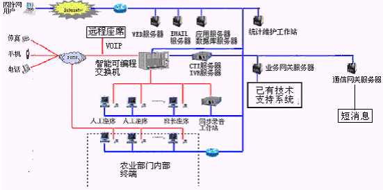 客戶利用電話、傳真、手機(jī)等撥打統(tǒng)一的特服號(hào)碼(如800XXX或9XXXX)或因特網(wǎng)進(jìn)入農(nóng)業(yè)分布式呼叫中心,本系統(tǒng)依托農(nóng)業(yè)部門各類計(jì)算機(jī)業(yè)務(wù)技術(shù)支持系統(tǒng)和網(wǎng)絡(luò)系統(tǒng),實(shí)現(xiàn)與農(nóng)業(yè)部門原有管理系統(tǒng)/業(yè)務(wù)系統(tǒng)及數(shù)據(jù)庫(kù)的無縫連接,通過人工受理或自動(dòng)語音服務(wù)等方式全天24小時(shí)不間斷地為客戶提供各種服務(wù)。