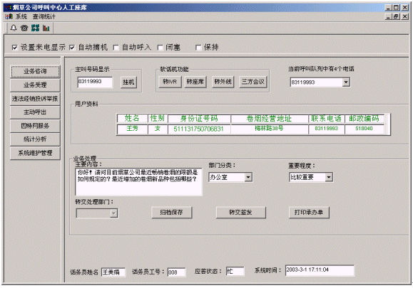 客戶打入電話后,當(dāng)系統(tǒng)的自動(dòng)語音應(yīng)答子系統(tǒng)無法解決客戶問題時(shí),客戶可選擇人工服務(wù),由客戶服務(wù)代表直接接聽客戶電話,處理并解決客戶問題。此時(shí)客戶同座席話務(wù)人員直接溝通,并同時(shí)記錄下該客戶的聯(lián)系方式,將相關(guān)數(shù)據(jù)添加入系統(tǒng)數(shù)據(jù)庫(kù);也可以在數(shù)據(jù)庫(kù)的支持下處理傳真業(yè)務(wù),電子郵件,計(jì)算機(jī)文件傳輸、滿意度調(diào)查等。
