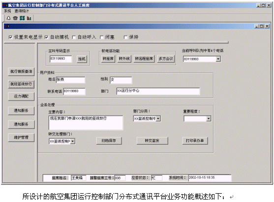 航空集團(tuán)運(yùn)行控制部門分布式通訊平臺(tái)將接入功能、導(dǎo)航功能、自動(dòng)語音查詢功能、人工座席服務(wù)功能、話路轉(zhuǎn)接功能、信息資料處理緊密聯(lián)系起來。本地或異地有關(guān)部門/工作人員撥打特服電話號(hào)碼后,可以根據(jù)需要選擇人工服務(wù)、自動(dòng)語音查詢、自動(dòng)留言,并能夠在幾種服務(wù)中來回切換或轉(zhuǎn)接其它電話,也可以路由到遠(yuǎn)程座席;所記錄的資料可以分門別類的進(jìn)行統(tǒng)計(jì)并形成報(bào)表,供相關(guān)部門進(jìn)行檢索查閱;意見處理完畢,可由人工座席主動(dòng)呼叫本地或異地有關(guān)部門/工作人員,告知處理意見,形成閉環(huán)處理流程;可定期進(jìn)行信息歸納、推演、預(yù)測(cè)等,從而得到信息深加工品。