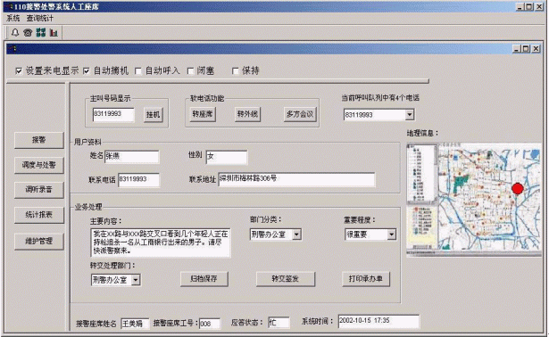 深圳博宇科技公司 110無(wú)線(xiàn)報(bào)警定位調(diào)度系統(tǒng)人工接警座席示意性界面如下: