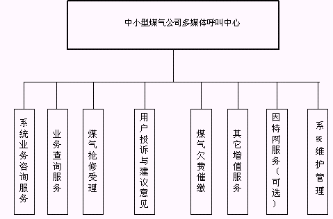 客戶利用電話、手機等撥打某一特服號碼(如9xxxx)進入中小型煤氣公司多媒體呼叫中心系統(tǒng),本系統(tǒng)依托煤氣公司各類業(yè)務技術(shù)支持系統(tǒng)和網(wǎng)絡系統(tǒng),通過人工受理或自動語音服務等方式全天24小時不間斷地為客戶提供各種服務。
