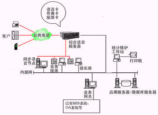 本系統(tǒng)物理結(jié)構(gòu)由帶語音板卡的高性能工控機(稱為綜合語音服務器,在功能上可以分為CTI服務器、IVR(交互式語音應答)/IFR服務器、統(tǒng)計維護管理工作站、數(shù)據(jù)庫/應用服務器、錄音留言工作站、業(yè)務網(wǎng)關服務器、業(yè)務代表座席、網(wǎng)絡系統(tǒng)等和應用軟件構(gòu)成。