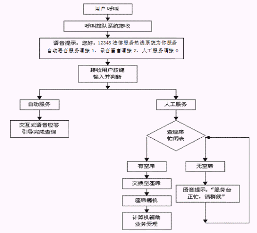 本系統(tǒng)將需轉(zhuǎn)入人工服務(wù)的用戶(電話)語(yǔ)音線路,根據(jù)一定的分配算法,將人民群眾打入的電話合理地分配給后臺(tái)的座席操作人員進(jìn)行處理,使系統(tǒng)的工作得以合理的分配。