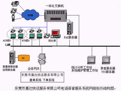 48個人工座席,落單組為30個人工座席(其中1個為落單組班長座席),查詢組為18個人工座席(其中1個為查詢組班長座席),48路全程同步錄音(可以實時設置或取消),64路IVR, 24路TTS通道,4路傳真,64條模擬中繼線路接入,支持普通話、廣東話等多語種服務的語音合成(TTS);提供各種話音、傳真集成服務,提供辦公時間服務流程與非辦公時間服務流程,人工服務落單,自助落單,貨物在途狀況人工服務查詢,貨物在途狀況自助查詢,業(yè)務咨詢,語音信箱,傳真服務等業(yè)務功能,實現(xiàn)與后臺下單系統(tǒng),貨物在途狀況查詢系統(tǒng),GPS系統(tǒng)等的無縫集成,為客戶提供24小時全天候的快捷優(yōu)質(zhì)服務。