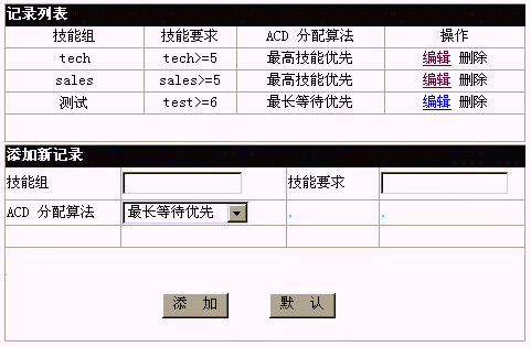 設(shè)置技能組:定義一個技能組名稱,給出一項技能的值范圍表達(dá)式,凡具備該技能且技能值屬于該范圍的座席,將自動加入該技能組。