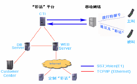 彩話業(yè)務(wù)與CRBT技術(shù)原理基本相同,當(dāng)呼叫進(jìn)入交換機(jī)后,獲取呼叫的主被叫信息后,由交換機(jī)同時(shí)發(fā)起兩個(gè)呼叫,一個(gè)去真正被叫,另一個(gè)去彩話系統(tǒng)。當(dāng)被叫方摘機(jī),首先控制主叫與被叫接通,彩話系統(tǒng)根據(jù)被叫用戶保存的定制的彩話信息和業(yè)務(wù)邏輯控制彩話系統(tǒng)的IVR單元對(duì)主被叫的通話進(jìn)行相應(yīng)的背景語(yǔ)音播放操作,該語(yǔ)音僅作為背景音樂(lè),不影響正常的雙方通話,類似于作一個(gè)三方會(huì)議的操作。當(dāng)被叫掛機(jī)時(shí),交換機(jī)將IVR單元和被叫的連接斷開。