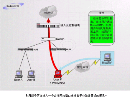 這是在企業(yè)網(wǎng)絡(luò)中常見的情況:如上圖中的F用戶作為企業(yè)的合法用戶,上網(wǎng)服務(wù)開通以后,有操作人員在F計算機中安裝代理服務(wù)軟件、NAT軟件或者安裝路由器軟件,再安裝Modem等遠程接入設(shè)備。非法用戶在遠端通過Modem等接入設(shè)備與網(wǎng)絡(luò)相連接。