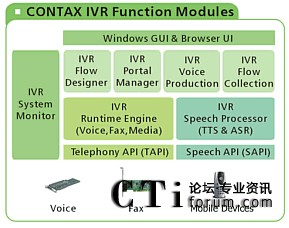 CONTAX IVR 是一個完整的媒體交換方案,可用于交互式語音應答、文字/語音轉(zhuǎn)換、電腦電話語音整合、傳真轉(zhuǎn)遞、自動傳真回覆 (FOD)、簡訊發(fā)送等等……