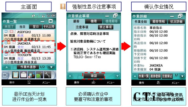 “MoBiz AP for CE支持系統(tǒng)”在加強(qiáng)總部和現(xiàn)場(chǎng)維修人員的聯(lián)動(dòng)基礎(chǔ)上,通過準(zhǔn)確把握地點(diǎn)信息和作業(yè)進(jìn)展?fàn)顩r,有效安排工作人員,從而達(dá)到提高工作人員一天的工作現(xiàn)場(chǎng)訪問次數(shù)。進(jìn)一步說,有助于客戶SLA(注3)的遵守和客戶滿意度(CS)的提高。
