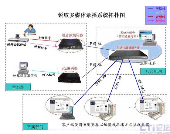如上圖所示,硬件系統(tǒng)采用了前后臺(tái)分離的模式,前端的視音頻編碼器將從終端上采集的視音頻信號(hào)與VGA編碼器采集的VGA信號(hào)進(jìn)行編碼,通過(guò)內(nèi)部專(zhuān)屬網(wǎng)絡(luò)傳輸?shù)胶笈_(tái)機(jī)房的錄播服務(wù)器中,通過(guò)服務(wù)器內(nèi)部功能模塊,不僅將整個(gè)會(huì)議或者培訓(xùn)現(xiàn)場(chǎng)的視音頻與電腦桌面內(nèi)容同步錄制保存在專(zhuān)屬硬盤(pán)中,同時(shí)將上述采集內(nèi)容實(shí)時(shí)轉(zhuǎn)發(fā)直播到用戶(hù)局域網(wǎng)中。通過(guò)錄播系統(tǒng)的身份驗(yàn)證機(jī)制,通過(guò)連接到網(wǎng)絡(luò)中的任意一臺(tái)PC即可接收直播的內(nèi)容。同時(shí)錄制保存在專(zhuān)屬硬盤(pán)上的內(nèi)容還可以后期點(diǎn)播回訪(需身份驗(yàn)證)。