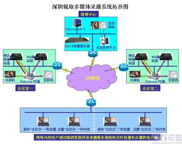 視音頻編碼器通過視音頻線采取視頻會議終端的圖像和聲音后,通過網(wǎng)絡傳輸?shù)焦芾碇行牡匿洸シ⻊掌,VGA編碼器通過VGA線采集VGA信號并通過網(wǎng)絡傳輸?shù)焦芾碇行牡匿洸シ⻊掌鳌?br />
