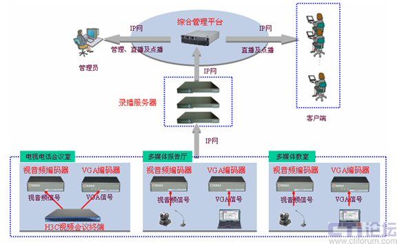 對(duì)于學(xué)校經(jīng)常進(jìn)行學(xué)術(shù)報(bào)告的錄播,可以將多媒體報(bào)告廳的視頻和音頻輸入到視音頻編碼器上,將電腦的VGA輸入到VGA編碼器上,視音頻編碼器和VGA編碼器可以將接入的信號(hào)進(jìn)行編碼,通過(guò)網(wǎng)絡(luò)傳給錄播服務(wù)器進(jìn)行信號(hào)處理、整合,最終傳輸?shù)骄C合管理平臺(tái)上。