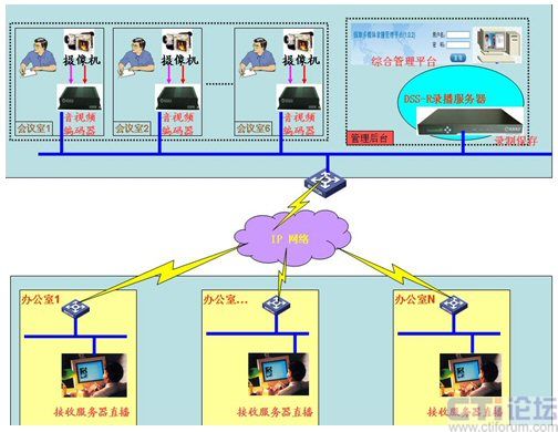 基于上述的需求,經(jīng)過調(diào)研選用深圳銳取錄播服務(wù)器產(chǎn)品完成上述的功能需求。如圖所示,通過放置在每個會議室考場內(nèi)的攝像機(jī),將竟聘者的圖像與聲音傳輸?shù)较噙B接的銳取公司的視音頻編碼器上,通過編碼器的編碼將采集的信號(通過內(nèi)部網(wǎng)絡(luò))傳輸?shù)胶笈_的管理平臺上的DSS-R錄播服務(wù)器中。服務(wù)器的直播模塊將從音視頻編碼器接收到的信號分發(fā)到網(wǎng)絡(luò)中,每個接入內(nèi)網(wǎng)絡(luò)的辦公室內(nèi)里的電腦通過專有客戶端接收考場實(shí)時內(nèi)容,實(shí)現(xiàn)了真正意義上的接受機(jī)關(guān)廣大干部群眾的監(jiān)督考察。同時錄播服務(wù)器內(nèi)置的錄制模塊,將收到的信號內(nèi)容解碼錄制保存(服務(wù)器內(nèi)有可供存儲的硬盤),為日后干部的選擇做到了有理可依,有據(jù)可查。