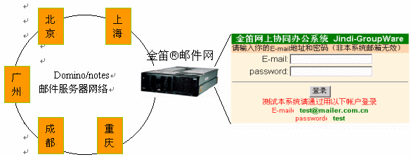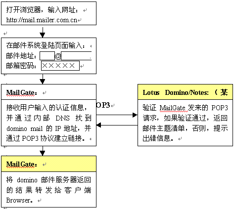 (1) 在不改變現(xiàn)有網(wǎng)絡(luò)硬件、軟件環(huán)境的情況下,添加一臺(tái)郵件網(wǎng)關(guān)服務(wù)器,通過統(tǒng)一的web登陸界面,輸入Email地址和密碼后,金笛?郵件網(wǎng)關(guān)會(huì)自動(dòng)根據(jù)內(nèi)部DNS找到該用戶所在的Domino Mail Server, 并通過標(biāo)準(zhǔn)郵件協(xié)議POP3提取該用戶的郵件,以web頁(yè)面形式顯示在用戶屏幕上。
