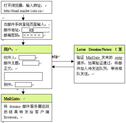 金笛郵件網(wǎng)關(guān)完全基于B/S架構(gòu)的設(shè)計(jì),使得郵件收發(fā)、管理都是基于瀏覽器完成,客戶端只要打開IE瀏覽器即可,無需做任何設(shè)置,大大方便了用戶。也就是說,在城域網(wǎng)任一節(jié)點(diǎn),都可以通過內(nèi)部域名(DNS)訪問郵件網(wǎng)關(guān),然后通過郵件網(wǎng)關(guān)與用戶所在的domino郵件服務(wù)器通訊,將郵件主題、郵件內(nèi)容顯示在web頁(yè)面上。金笛?郵件網(wǎng)關(guān)的具體工作流程如下: