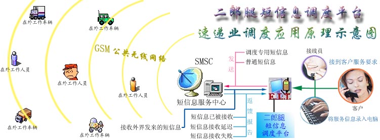 二郎腿短信息調(diào)度平臺是利用目前社會上大眾普遍擁有手機(jī)的現(xiàn)成資源,通過移動通訊公司提供的短信息服務(wù)功能作為通信信道,直接對手機(jī)進(jìn)行低層操作控制,以“收發(fā)短信息”的方式來實(shí)現(xiàn)信息的傳遞(通信資費(fèi)標(biāo)準(zhǔn)與在手機(jī)上收發(fā)短信相同)。調(diào)度平臺還對每條發(fā)出的信息的接收狀態(tài)進(jìn)行跟蹤,確保信息能被安全