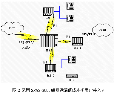 SPAS可編程交換機(jī)通過E1可以支持多個(gè)遠(yuǎn)端模塊。遠(yuǎn)端模塊采用SPAS-SAS框,可以帶多種用戶接口:普通模擬用戶、DDN、環(huán)路中繼用戶;通過 SPAS主模塊對外提供各種信令接入。適合多點(diǎn)接入組網(wǎng),且組網(wǎng)成本低。組網(wǎng)圖見圖2: