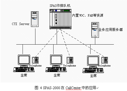 目前國內(nèi)呼叫中心的建設(shè)方興未艾,企業(yè)為了改善服務(wù),贏得客戶,紛紛建設(shè)自身的呼叫中心。如果建立呼叫中心全部采用國外設(shè)備,價(jià)格非常昂貴,使很多客戶望而卻步。這樣大的投資目前也只有電信(包括移動和聯(lián)通)、電力、銀行等資金充裕的行業(yè)才能承受。而且,根據(jù)我方了解,即使這些行業(yè)也在控制采購成本,原先只注重名牌,不計(jì)成本的情況正在改變。而在目前宏觀經(jīng)濟(jì)形勢不景氣的大背景下,大中型企業(yè)既要加快企業(yè)信息化建設(shè),保住客戶,降低成本,又要精打細(xì)算,規(guī)避投資風(fēng)險(xiǎn)。我們掌握建立呼叫中心設(shè)備的所有核心技術(shù),因此在呼叫中心應(yīng)用方面有很大的價(jià)格優(yōu)勢,這樣就降低了擁有呼叫中心的門檻,在這個(gè)市場上也有很強(qiáng)的競爭力。采用SPAS-2000可編程交換機(jī)支持智能業(yè)務(wù)通用編程接口,可以作為CallCenter核心設(shè)備,應(yīng)用圖見圖4: