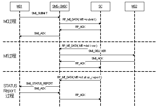 上圖是表示出了一個(gè)移動(dòng)臺(tái)MS1向另一移動(dòng)臺(tái)MS2發(fā)送短消息的典型過(guò)程,圖中忽略了MSC、HLR、BS等功能實(shí)體,重點(diǎn)說(shuō)明的是MO、MT、StatusReport三個(gè)典型過(guò)程中,SMS-GMS與SC之間的消息序列。
