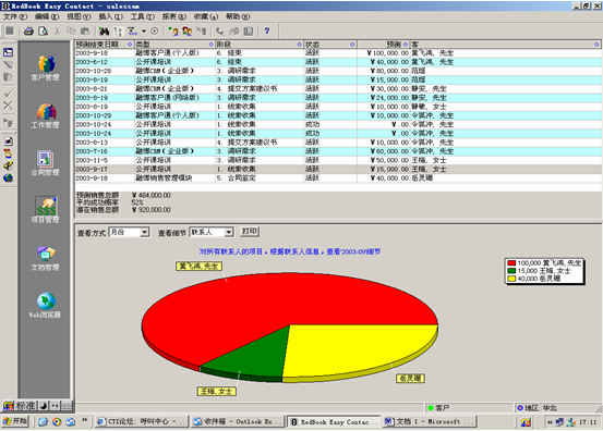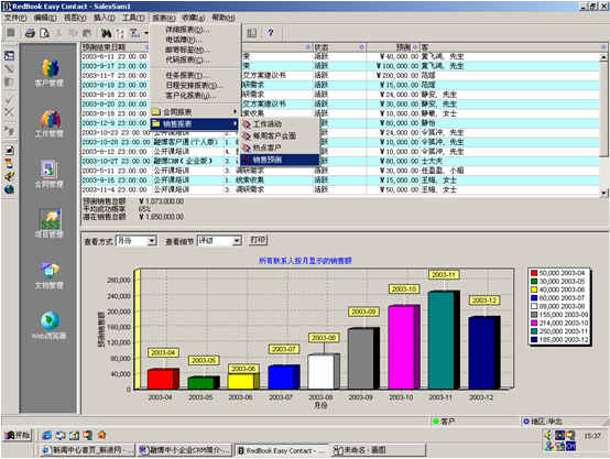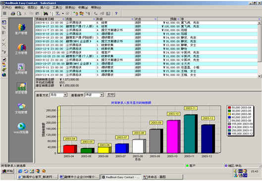 可根據(jù)月份、項目階段、聯(lián)系人、客戶、項目級別、銷售代表等條件進(jìn)行查看項目細(xì)節(jié),其中有詳細(xì)項目情況列表,也包括圖示。