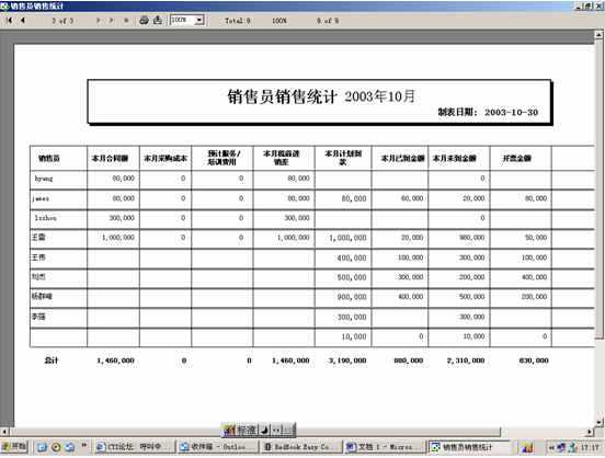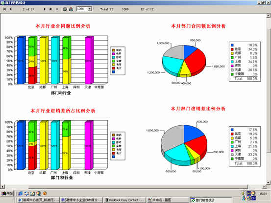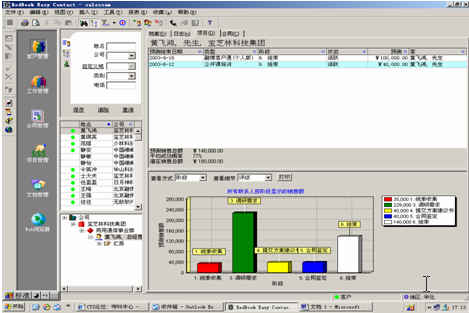 可對客戶(雇員)合同,根據(jù)合同階段、月份、合同金額、合同應(yīng)收應(yīng)付款、采購成本、客戶、銷售人員等條件進(jìn)行查詢和統(tǒng)計, 查詢統(tǒng)計結(jié)果以詳細(xì)列表及圖示進(jìn)行顯示。
