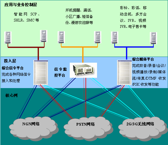 2. 在同一平臺融合支持多種電信網(wǎng)絡(luò)技術(shù)規(guī)范,包括2G/3G/NGN的信令、交換、多媒體處理功能,為現(xiàn)在與將來的電信增值業(yè)務(wù)提供了值得長期合作的基礎(chǔ)平臺;