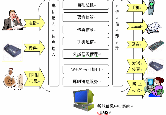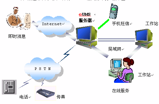 整個系統(tǒng)以eUMS服務器為核心,對內(nèi)連接企業(yè)局域網(wǎng),對外連接互聯(lián)網(wǎng)。eUMS內(nèi)配置一塊語音/傳真卡,負責電話、傳真的接入。如果企業(yè)需要自己的短信服務,也可以在eUMS服務器上安裝手機短信網(wǎng)關(guān),外接一部手機即可。