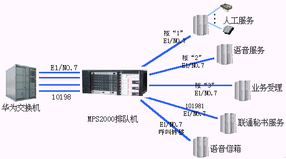 我司的排隊(duì)機(jī)通過E1與華為交換機(jī)相連,采用No.7信令。華為交換機(jī)將需要播放語音的中繼直接轉(zhuǎn)接到排隊(duì)機(jī)上,由排隊(duì)機(jī)相應(yīng)的中繼板和語音導(dǎo)航板提供語音通道和DTMF收號,根據(jù)用戶的按鍵選擇轉(zhuǎn)接到相應(yīng)的語音平臺上去。這樣的系統(tǒng)很好的解決了四川聯(lián)通的需求。