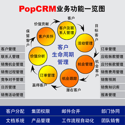 PopCRM吸收了國內外先進的管理思想,以客戶的需求為根本,以應用價值為核心,聚焦銷售環(huán)節(jié),對客戶資源統(tǒng)一管理,規(guī)范銷售行為;對銷售進行分析預測,提供決策依據(jù);對客戶進行全面分析,提供客戶關懷,吸引并留住客戶,全面提高企業(yè)的盈利能力。