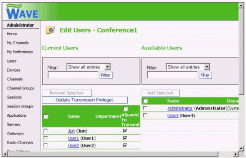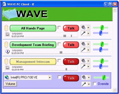 WAVE的使用方式為:管理員在服務器端建立IP電話會議,參加者使用本地計算機作為客戶端,通過耳機和麥克風即可加入會議。一臺普通的奔四PC機可以支持數(shù)千個會議,每個會議也允許數(shù)百個用戶參加。管理員可以分配用戶不同的權(quán)利:如講話,主持會議等等。
